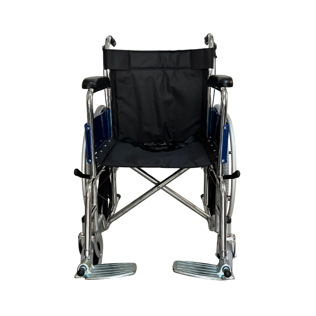 Cuenta con doble sistema de freno —en las manijas para el acompañante y junto a las ruedas para el usuario— garantizando control total en todo momento. Su asiento y respaldo de lona negra antitranspirante brindan confort y durabilidad, y su sistema plegable facilita el transporte y almacenamiento. Además, cuenta con doble cruceta